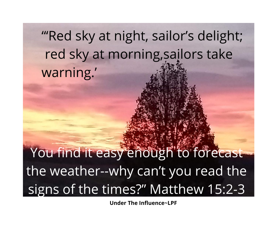 “‘Red sky at night, sailor’s delight; red sky at morning, sailors take warning.’ You find it easy enough to forecast the weather–why can’t you read the signs of the times?” (Matthew 15:2-3) What I am seeing is a nation full of disguised faces, making it difficult to read expressions and muffled voices which may or may not be understood. I don’t wear hearing aids and I’m told I don’t need them, however, I have difficulty understanding the words sometimes. Not being able to see the person’s lips or expression, leaves me asking them to repeat or walking away without understanding what was said.